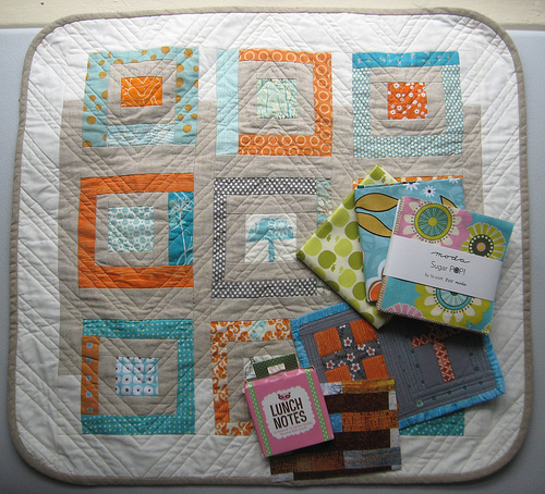 A cross rug mug, lunch notes, a lunch tote (that my kids ran off with!), a fq of lime apples, extra of the Riley Blake print from the backing, and a charm pack of Sugar Pop! I am thinking about making myself a throw quilt with the charm pack, the whole line is pretty! Thanks Pam, for making the end of this round so very sweet for me!